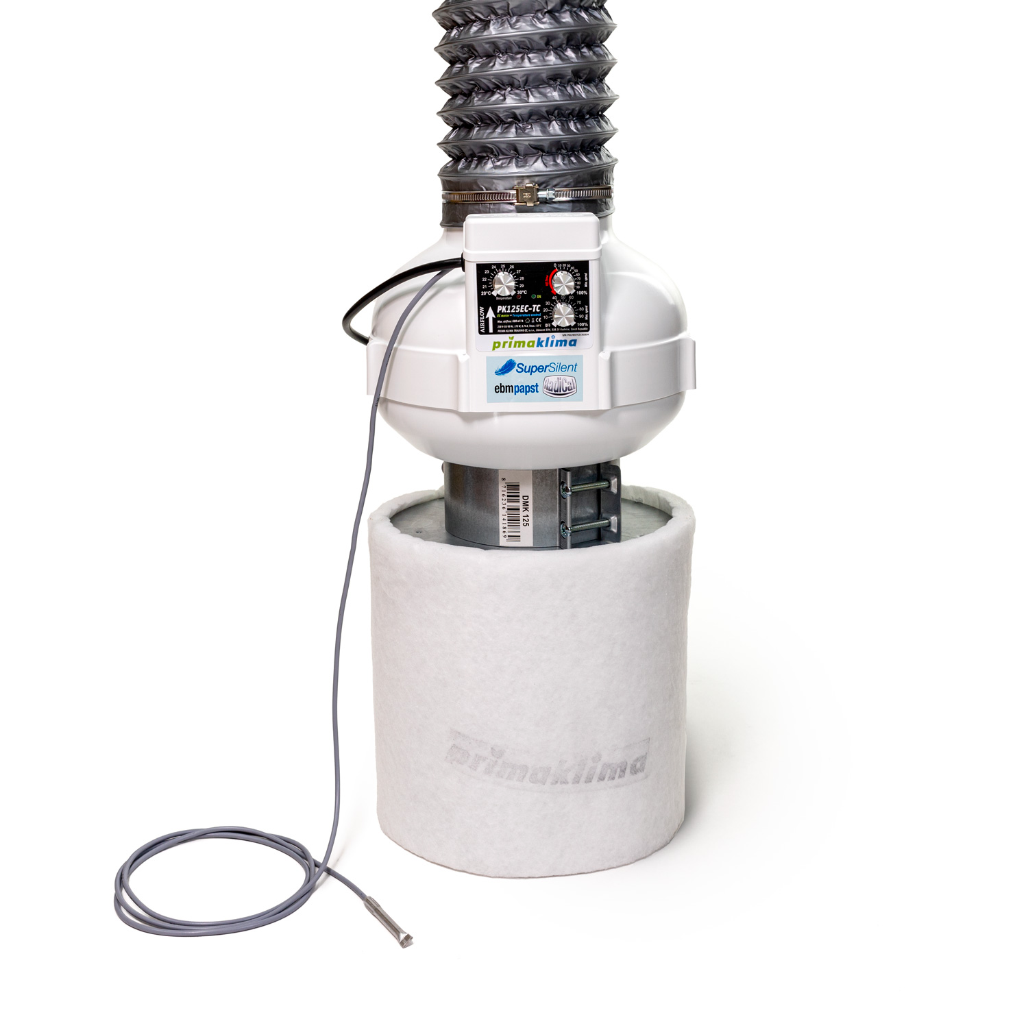 PrimaKlimaDas PrimaKlima PKVS-125EC-TC Abluftset bietet einen temperaturgesteuerten EC-Ventilator (680 m³/h) und ein K2601-flat-125 Aktivkohlefilter für effiziente Geruchsabsorption, leisen Betrieb und Energieeinsparung durch ebm-papst Motor.