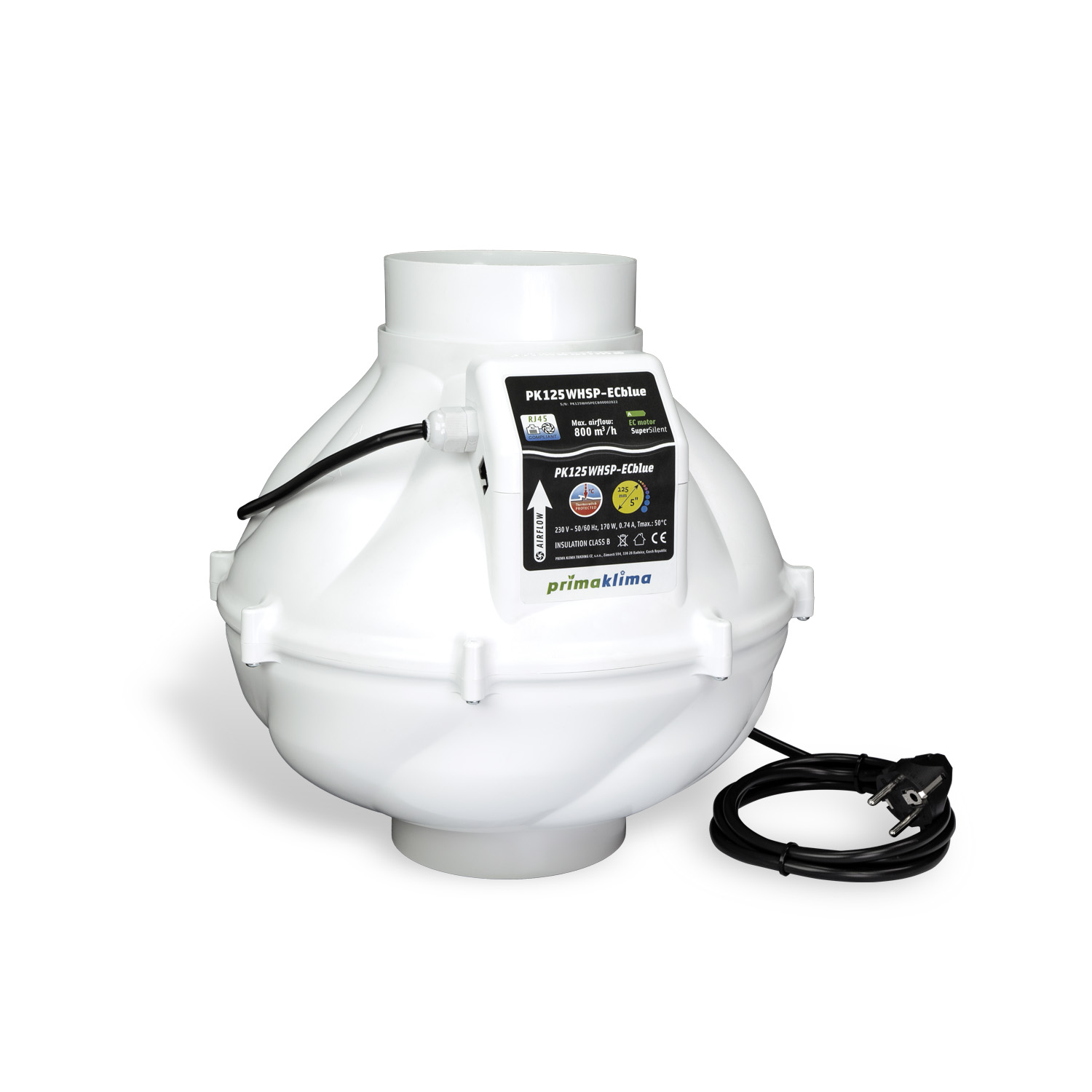 PrimaKlima Whisperblower ECBlue - Ø125mm - 0 bis 800 m³/h - RJ45-Anschluss - Rohrventilator