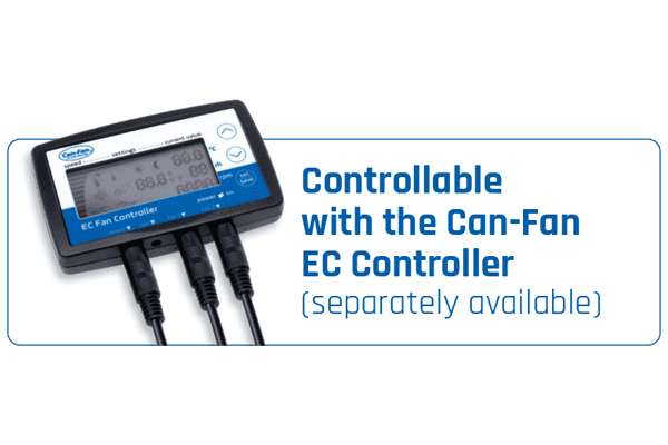 Der Ventilator ist mit einem modernen EC-Motor (Electronically Commutated) ausgestattet. Diese Motoren arbeiten wesentlich effizienter als klassische AC-Motoren, bieten höhere Druckleistung, geringeren Stromverbrauch und eine längere Lebensdauer. Außerdem sind sie stufenlos regelbar, z. B. mit dem Can-Fan EC Speed Controller.