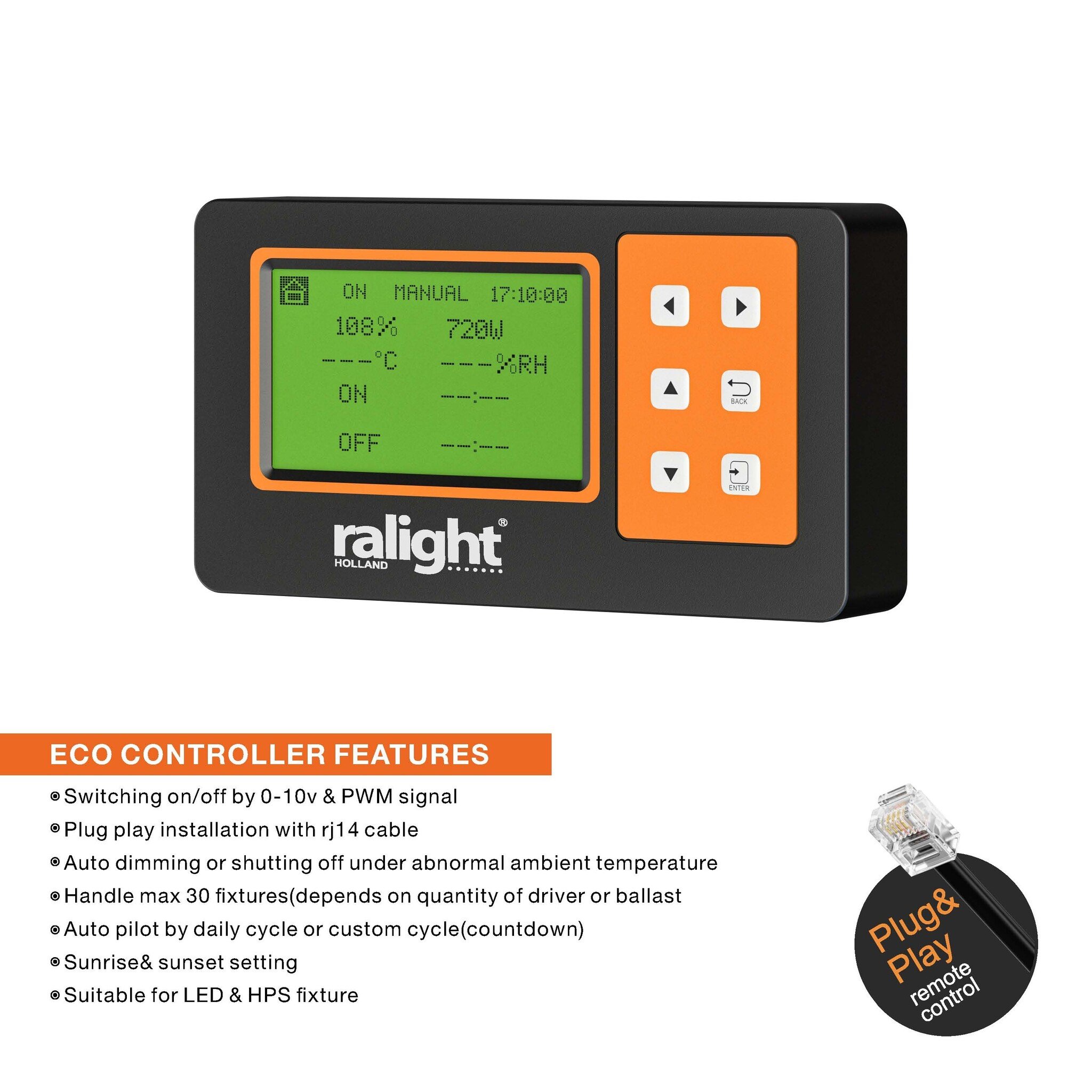 RalightDer Ralight ECO LED Controller 0–10V steuert bis zu 30 LED-Lampen, mit Sonnenaufgangssimulation, Temperaturschutz und einfacher Plug & Play-Installation für den professionellen Einsatz.