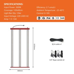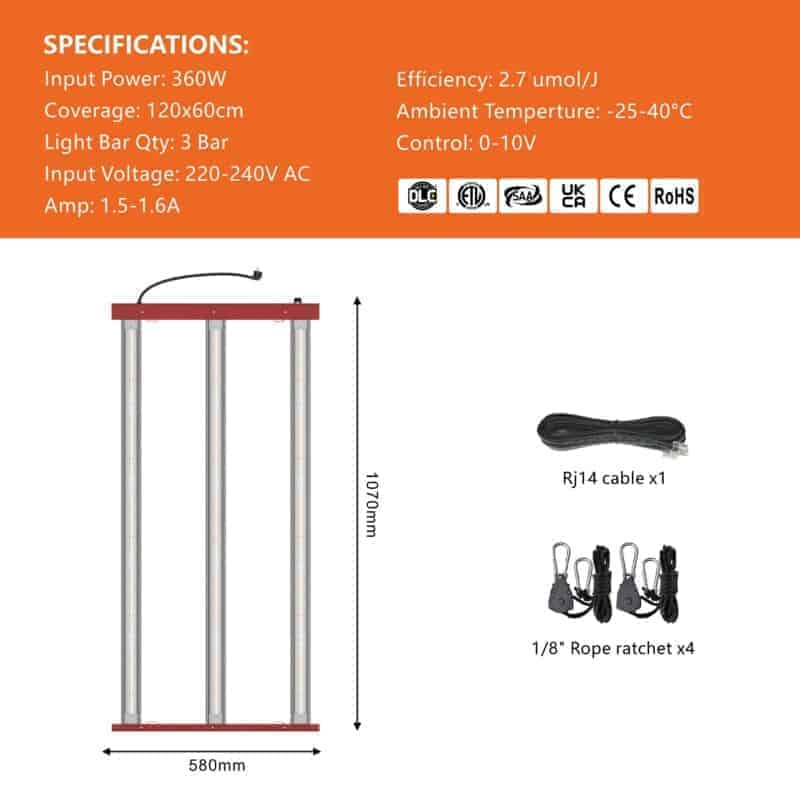 RalightRalight LED 360W 3 Bars – leistungsstarke Pflanzenlampe (120x60 cm) mit Full-Spectrum-Licht (972 μmol/s, 2,7 μmol/J), einstellbarer Leistung und robustem Design. Perfekt für Wachstums- und Blühbedingungen in Growboxen und mehrschichtigen Systemen.