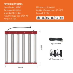 Gleichmäßige Lichtverteilung: Das lineare Design mit 6 Lichtbalken sorgt für eine konsistente Lichtverteilung auf einer Fläche von 60x60cm und ist ideal für mehrschichtige Systeme, niedrige Räume und Gewächshäuser.
