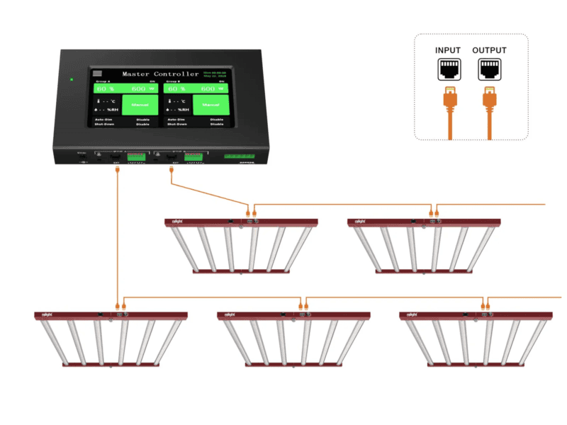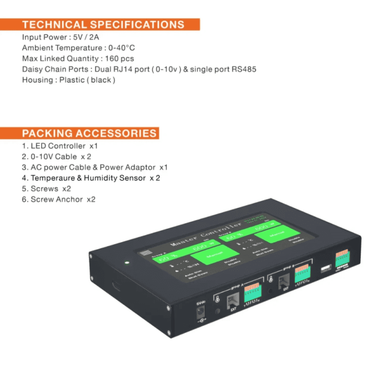 Der Ralight LED Touchscreen Controller 0-10V ist ein leistungsstarker Lichtcontroller für professionelle und großflächige Anbauumgebungen. Mit diesem Controller lassen sich bis zu 300 LED-Leuchten präzise steuern, aufgeteilt in zwei unabhängige Zonen. Dank des übersichtlichen Touchscreens, intelligenter Automatisierungen und integrierter Sensorik bietet das System maximale Kontrolle bei minimalem Aufwand.