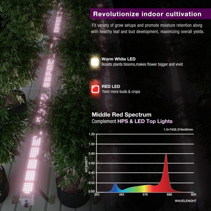 - Medium Red Spectrum: Speziell abgestimmt für die Wachstums- und Blütephase, ideal in Kombination mit HPS- und LED-Beleuchtung.