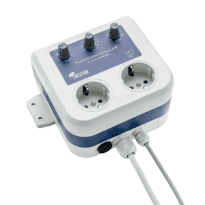 Der SMSCOM TwinController Mk2 4,5 A ist ein kompakter, aber sehr vollständiger Regler, mit dem Sie die Abluft in Ihrem Anbauraum einfach steuern können. Dieses Gerät steuert zwei Abluftmotoren oder Rohrventilatoren (Zu- und Abluft) gleichzeitig und sorgt dafür, dass die eingestellte Temperatur präzise eingehalten wird. Dank der automatischen Thermostatfunktion werden die Drehzahlen kontinuierlich angepasst, sodass Sie stets ein stabiles Klima gewährleisten können.