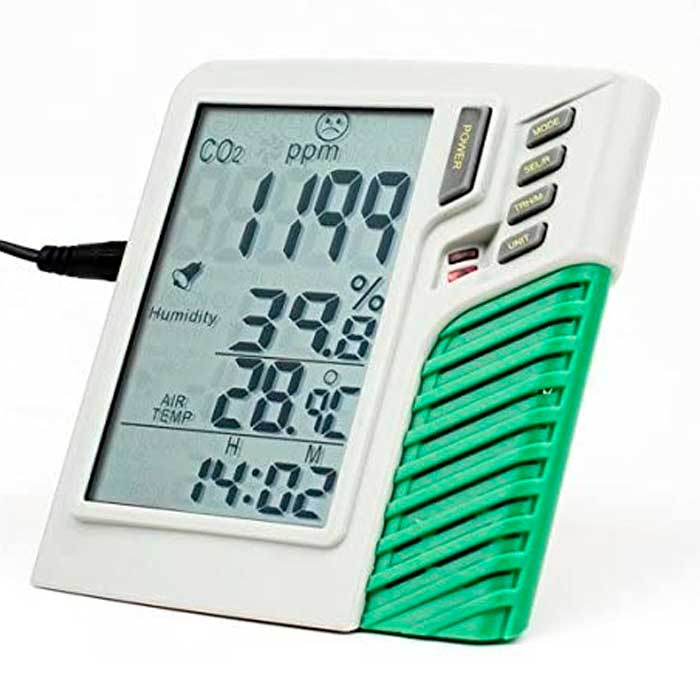 - Großes LCD-Display – Gleichzeitige Anzeige von CO₂-Werten, Temperatur, Luftfeuchtigkeit, Datum und Uhrzeit.