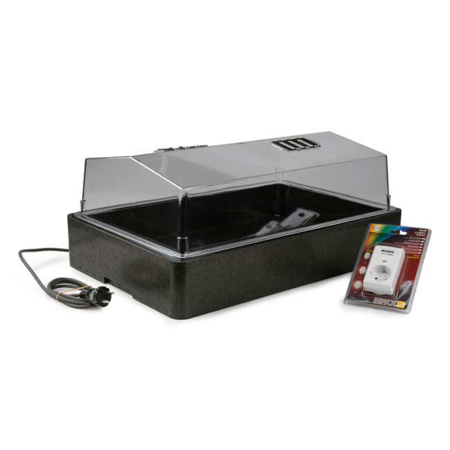 Mit dem beheizten Gewächshaus Propagator 64/50 können Sie erfolgreich Samen und Stecklinge züchten, auch unter schwierigen Bedingungen. Der Propagator 64/50 verfügt über eine hervorragende Isolierung und eine leistungsstarke Heizung von 50 Watt, die es ermöglicht, im Inneren Temperaturen bis zu 30 Grad Celsius zu erreichen, selbst bei einer Umgebungstemperatur von 0 Grad Celsius. Die Temperatur im Gewächshaus kann präzise mit dem mitgelieferten Plug-In-Dimmer eingestellt werden.